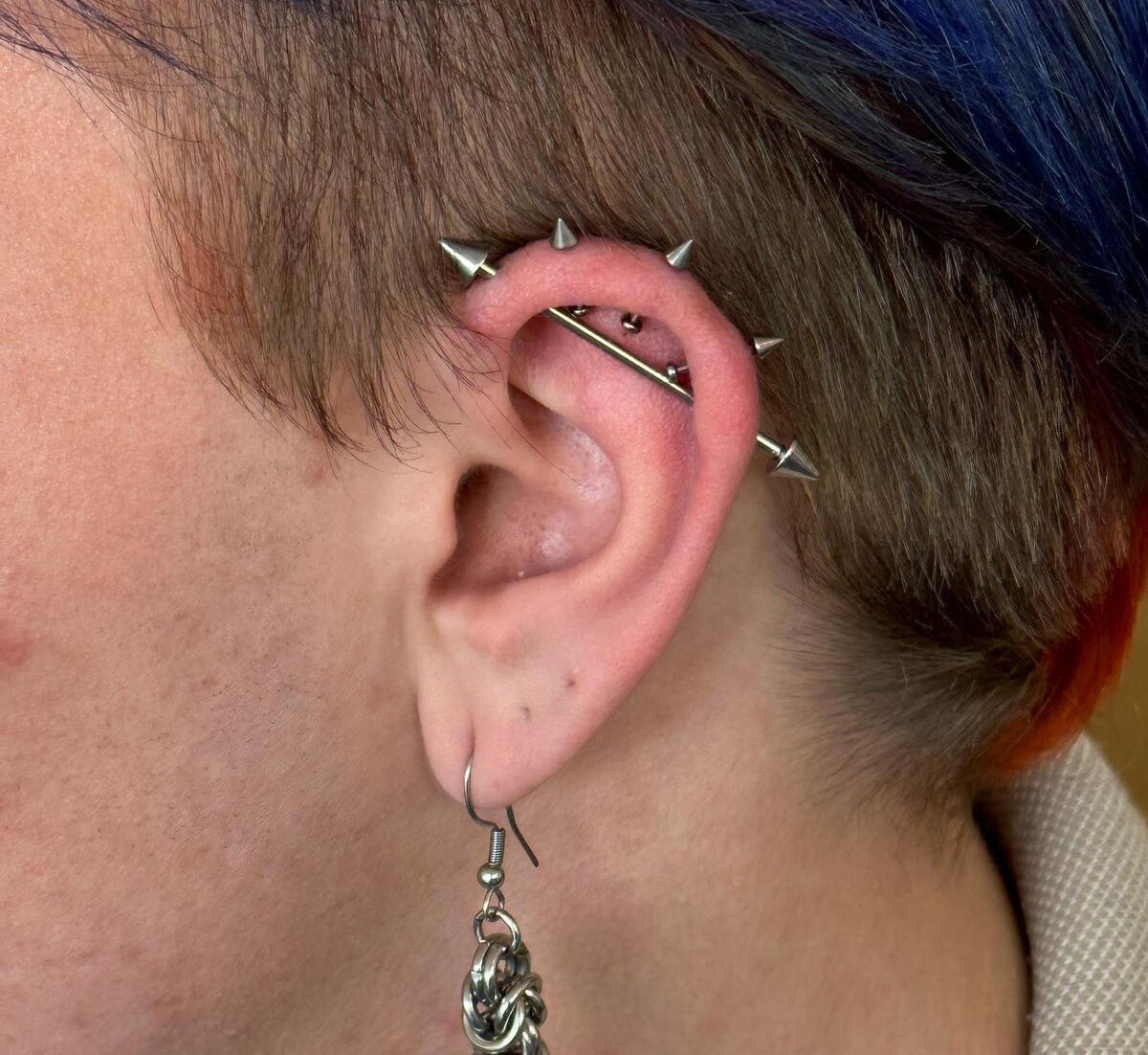 All of these piercings are similar in terms of how to care for them. Clean them two times a day with a sterile saline wound wash (see below in "how to clean"). Don’t touch twist or rotate the piercings especially with dirty hands. Keep your hands clean ** any ** time you touch your piercing. Keep wet hair out of the way of the piercing to the best of your ability, keeping the piercing too wet can cause a moisture induced irritation bump. Along with hair, be extremely careful when doing generally anything to your hair (brushing, washing, towel or blow drying). It is far too easy to catch, and pull on these piercings (in your sleep, when showering, when you put on/remove clothing); be sure to downsize the posts once you start noticing room in the bar again. If you fail to downsize your posts, it will (almost always) result in extreme migration. Due to catching it, as mention in the lists above. In most cases with migration, you will likely need to retire the piercing all together, and repierce once the wound has healed.Heal time:Lobe: ~6-8 weeks